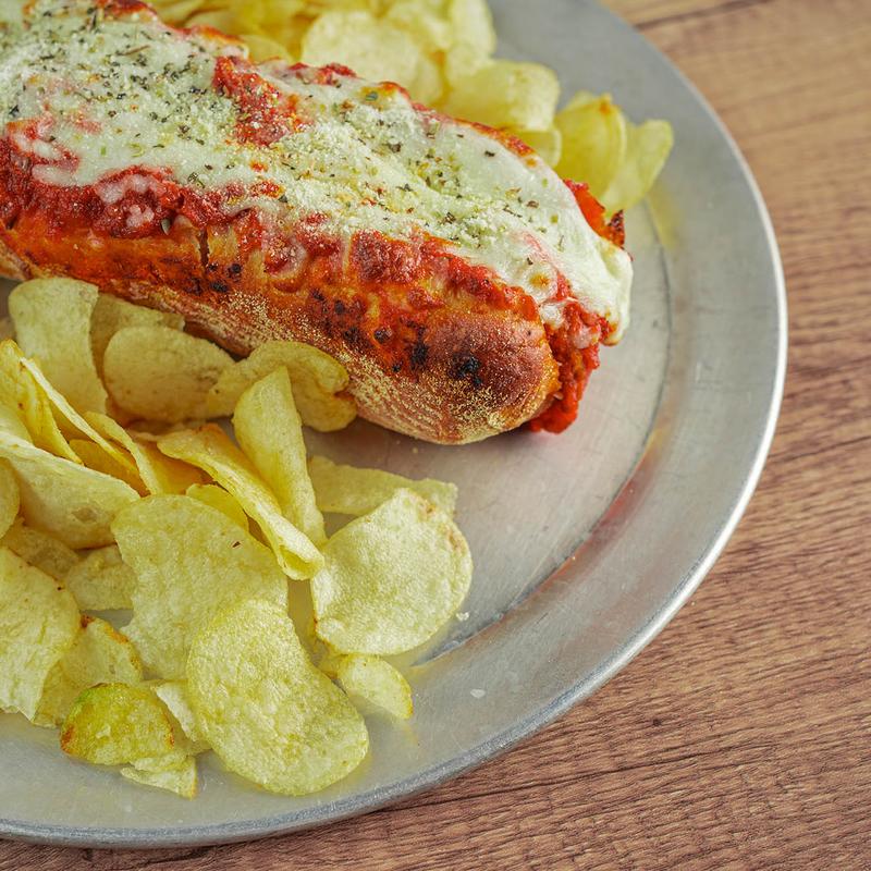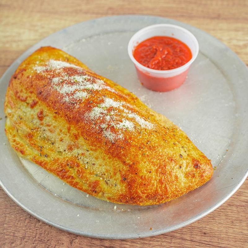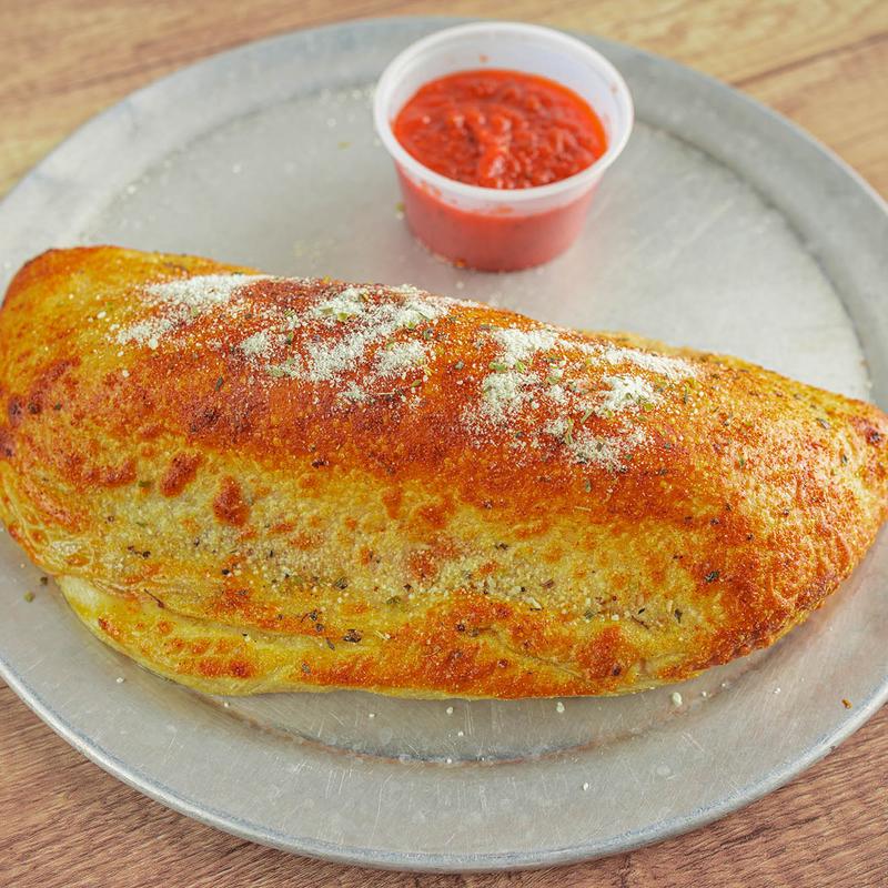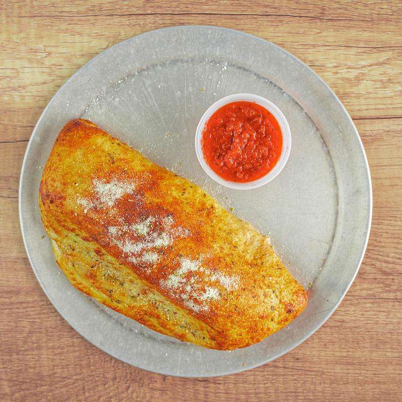 Pizza crust pocket stuffed with sauce, cheese, and any three pizza toppings of your choosing
